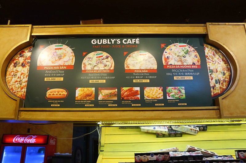 Fantasy Park 室內遊樂園入口的Gubly’s Cafe,炸雞100,000VND、三明治跟各種口味的比薩125,000VND。如果只想吃個點心,也有麵包、蛋糕之類的(50,000~70,000VND)。