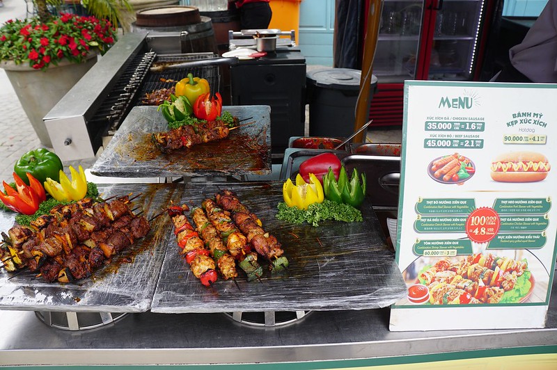 烤肉串120,000 VND,雞肉、豬肉、牛肉、鴕鳥肉都有,烤蝦價格便宜些,只要80,000VND。