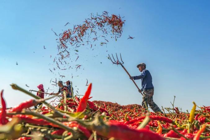 ▲ 新疆塔城沙湾县的农民正在晾晒辣椒。