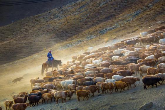 ▲ 新疆阿勒泰,哈萨克牧民赶着牛羊群进行秋季转场。