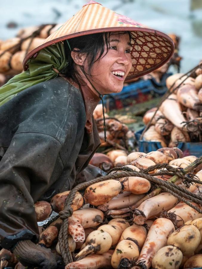 ▲ 广东江门台山,村民喜悦丰收莲藕。