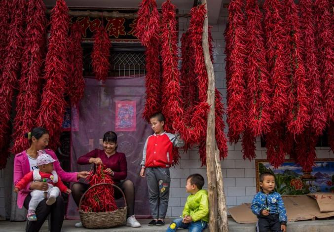 ▲ 贵州毕节市金鸡村村民在整理晾晒的辣椒。