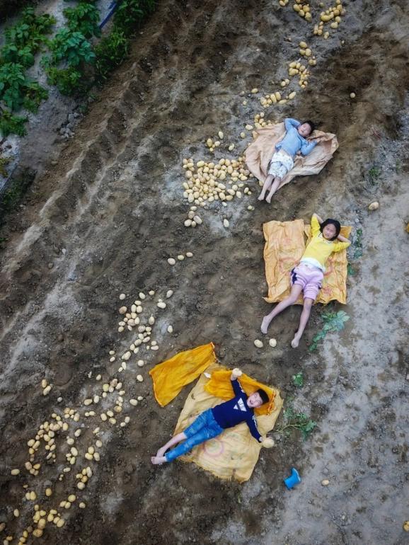 ▲ 广州市增城小楼镇小孩在开心地收土豆。