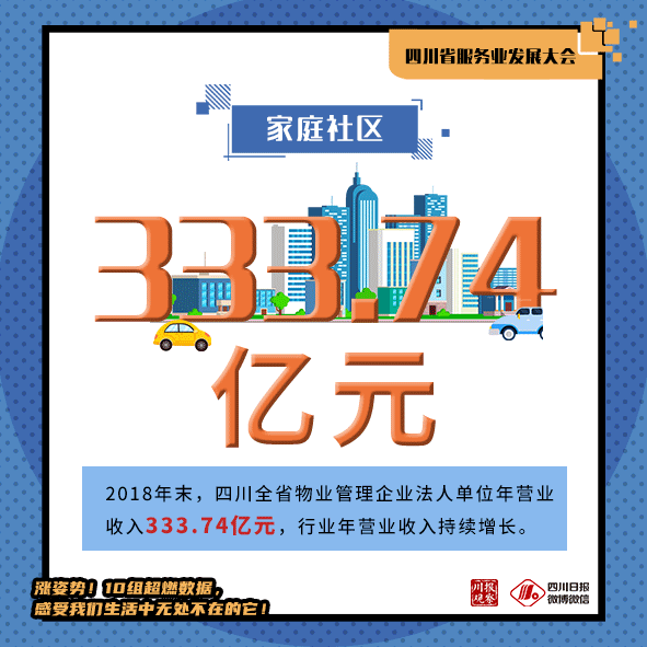 根据四川省第四次全国经济普查公报显示,物业管理相关数据在四川省第三产业数据中颇具分量,从主要经济指标来看,2018年末,四川省物业管理企业法人单位7117个,比2013年末增长116.4%;2018年末,物业管理企业法人单位从业人员31.03万人,比2013年末增长69.9%;2018年末,全省物业管理企业法人单位的资产1033.51亿元,比2013年末增长219.1%;2018年末,全省物业管理企业法人单位年营业收入333.74亿元,行业年营业收入持续增长。