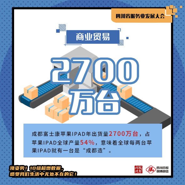 四川机电产品占进出口主导地位。2019年,四川出口机电产品3197.4亿元,增长18%,占同期四川外贸出口总值的82.1%。你知道吗?成都富士康苹果IPAD年出货量2700万台,占苹果IPAD全球产量54%,意味着全球每两台苹果IPAD就有一台是“成都造”。