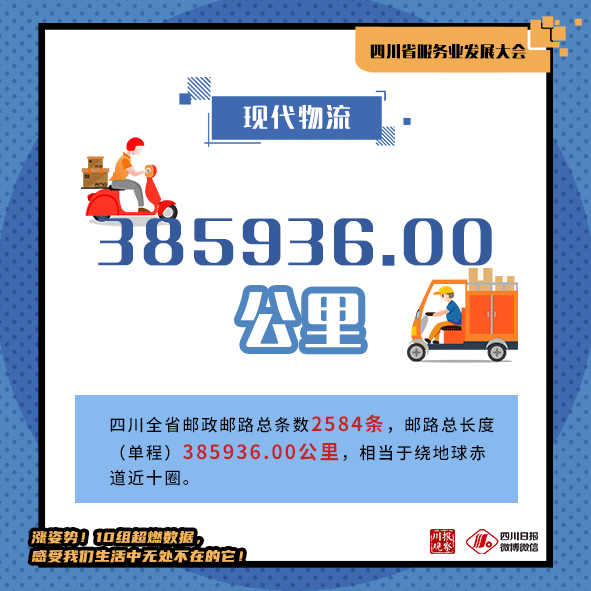 四川全省邮政邮路总条数2584条。邮路总长度(单程)385936.00公里,相当于绕地球赤道近十圈。全省人均函件量为0.32件,每百人订有报刊量为8.78份,年人均快递使用量为21.39件。年人均用邮支出357.98元,年人均快递支出243.09元。