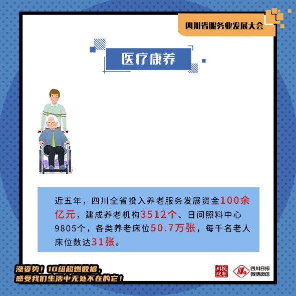 近五年,四川全省投入养老服务发展资金100余亿元,建成养老机构3512个、日间照料中心9805个,各类养老床位50.7万张,每千名老人床位数达31张。开展国家级和省级医养结合试点,医养结合服务机构达2000余家,护理型床位10万余张。全面建立80周岁及以上老年人高龄津贴制度,发放津贴20.1亿元。普遍建立居家养老服务补贴制度,为特殊困难老年人提供服务达1100万人次。