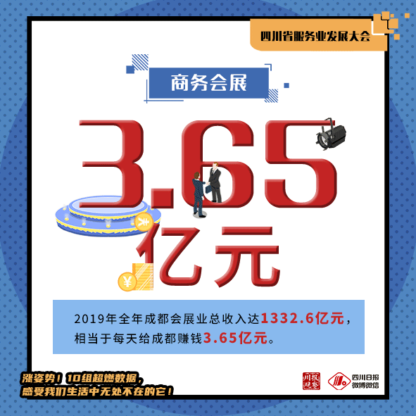 作为西部会展大省,每年四川会举办很多重大展会。2019年全年成都共举办重大会展项目866个,相当于平均每天举办2.37个重大会展项目。2019年全年共有11622.6万人次来成都参展参会,相当于平均每天有31.84万人次。2019年全年成都会展业总收入达1332.6亿元,相当于每天给成都赚钱3.65亿元。
