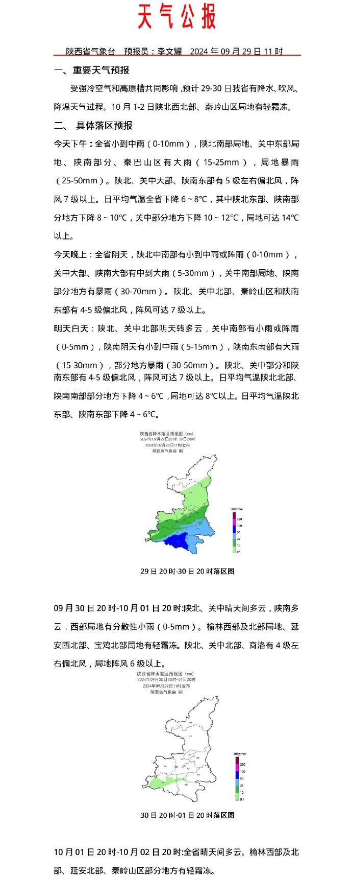 受强冷空气和高原槽共同影响,预计29-30日我省有降水、吹风、降温天气过程。10月1-2日陕北西北部、秦岭山区局地有轻霜冻。