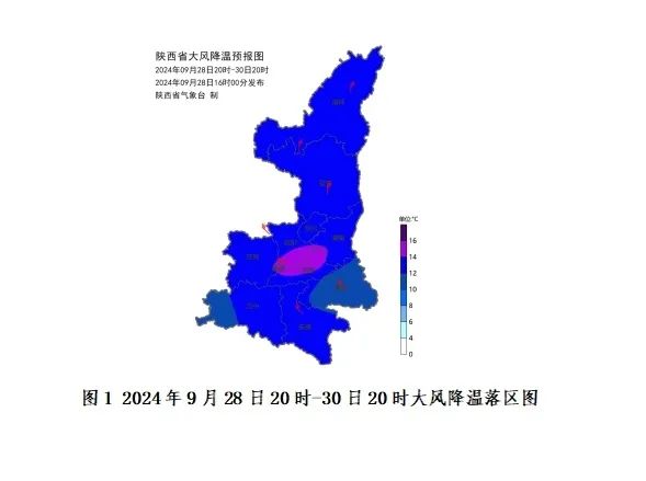 陕西省气象台2024年9月28日16时30分发布寒潮和大风蓝色预警:寒潮降温:受较强冷空气影响,我省自北向南将出现大风降温天气,预计28日20时至30日20时,全省日平均气温下降10~12℃,其中陕北西部、关中大部、陕南部分地方日平均气温下降12~14℃,关中南部局地下降14℃以上(图1)。预计最低气温出现在10月1日凌晨(图2):陕北大部、咸阳北部局地1~3℃(达到寒潮蓝色预警标准(图3)),关中5~10℃,商洛6~8℃,汉中、安康9~11℃。