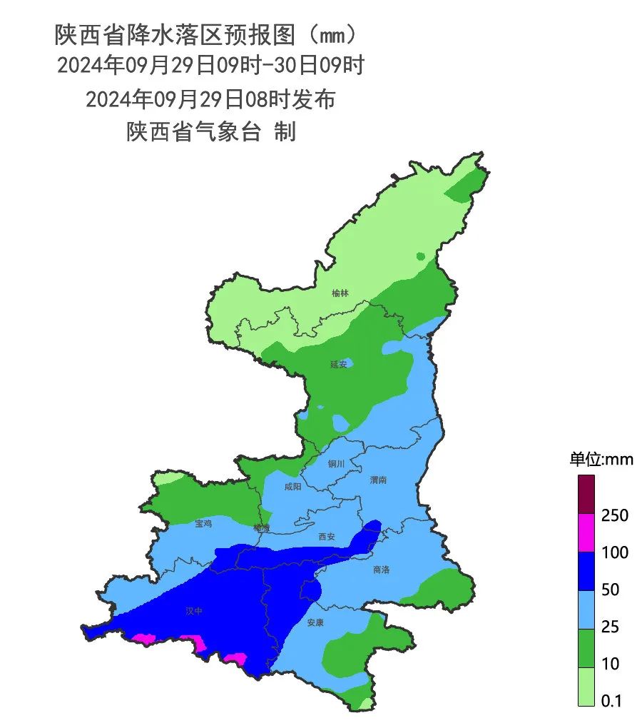 受高原槽东移影响,预计9月29日09时至30日09时(未来24小时),陕北南部、关中大部、陕南大部有大雨(25~50毫米)。以下6市将出现暴雨(50~100毫米),包括:宝鸡南部(太白、眉县)、西安南部山区(周至南部、鄠邑区南部、长安区南部、蓝田、临潼南部)、渭南南部(临渭区南部、华洲区南部)、汉中各区县、安康西部(汉滨区、汉阴、石泉、宁陕、紫阳西部)、商洛西部局地(柞水西部、镇安西部、商州西部)。特别是汉中南部区县可能出现大暴雨(100~150毫米),包括:宁强、南郑、镇巴。由于降水对流性较强,落区有一定不确定性,上述相邻县区也需高度关注。降水期间部分地方伴有短时暴雨(最大小时雨量20~40毫米,局地可达50毫米以上)、雷暴大风等强对流天气。本次降雨强度大,需重点防范陕北黄土高原沟壑区、淤地坝,关中渭河流域,陕南汉江流域强降水诱发的城市内涝、山洪、中小河流洪水以及滑坡、泥石流、崩塌等次生衍生灾害。