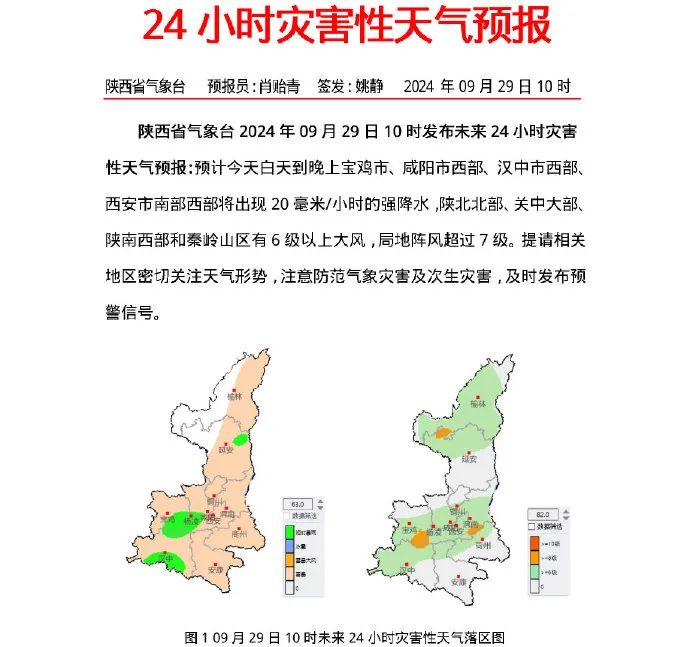 陕西省气象台2024年09月29日10时发布未来24小时灾害性天气预报:预计今天白天到晚上宝鸡市、咸阳市西部、汉中市西部、西安市南部西部将出现20毫米/小时的强降水,陕北北部、关中大部、陕南西部和秦岭山区有6级以上大风,局地阵风超过7级。提请相关地区密切关注天气形势,注意防范气象灾害及次生灾害,及时发布预警信号。