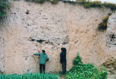 在田野边的断层处可以清晰地看到很厚的遗址层,在断层下端我挖出一块瓦片,而在断层的上面挖到两块褐色的瓷碗片,再向上1米就是地面的麦地。当地的老乡告诉我们,这几年时有西北和西安各校的老师带着学生到这里考察,陕西研究历史的学者也经常到这里来,可见西北的史学家们对魏家崖村重视了。