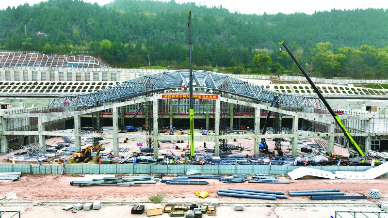 “项目工期比较紧张,为保证今年顺利通车,春节期间,100多名工人坚守岗位,全力抢工确保整体工程进度。”四川铁建汉巴南铁路站房项目经理韩帅说,目前主要在对天幕钢结构周边进行封边施工。