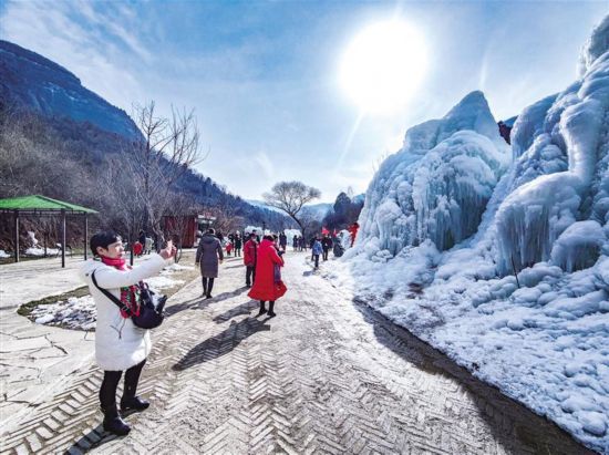 薛家寨冰瀑景观吸引众多游客前来观赏拍照。