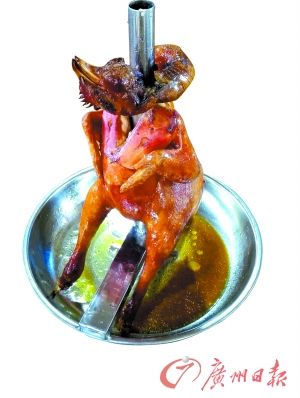 “栋企鸡”颜色金黄,所以又叫金黄烧鸡。其体内穿过一根钢管而直立,它好像是在围绕着钢管“跳舞”,因此又被称为“钢管鸡”。这种农家鸡做法近年在罗定走红。