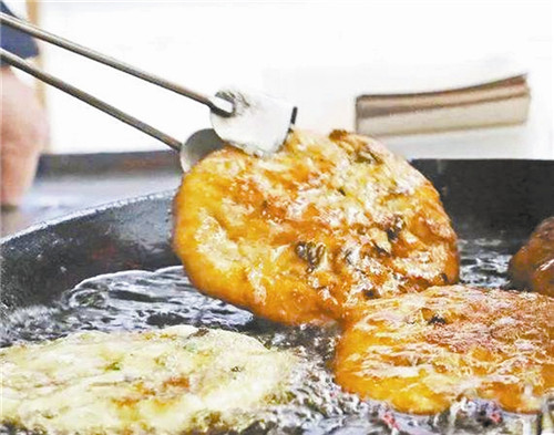 新鲜出炉的咸菜饼,趁热咬上一口,面皮炸裂,满满的咸菜和肉末,还洋溢着热乎劲,唇齿留香。这道咸菜饼位列平阳的排队小吃前三甲,面团、咸菜、肉末也是提前做好,按压成型后放入油锅内翻上几回,待色泽金黄后出锅的。