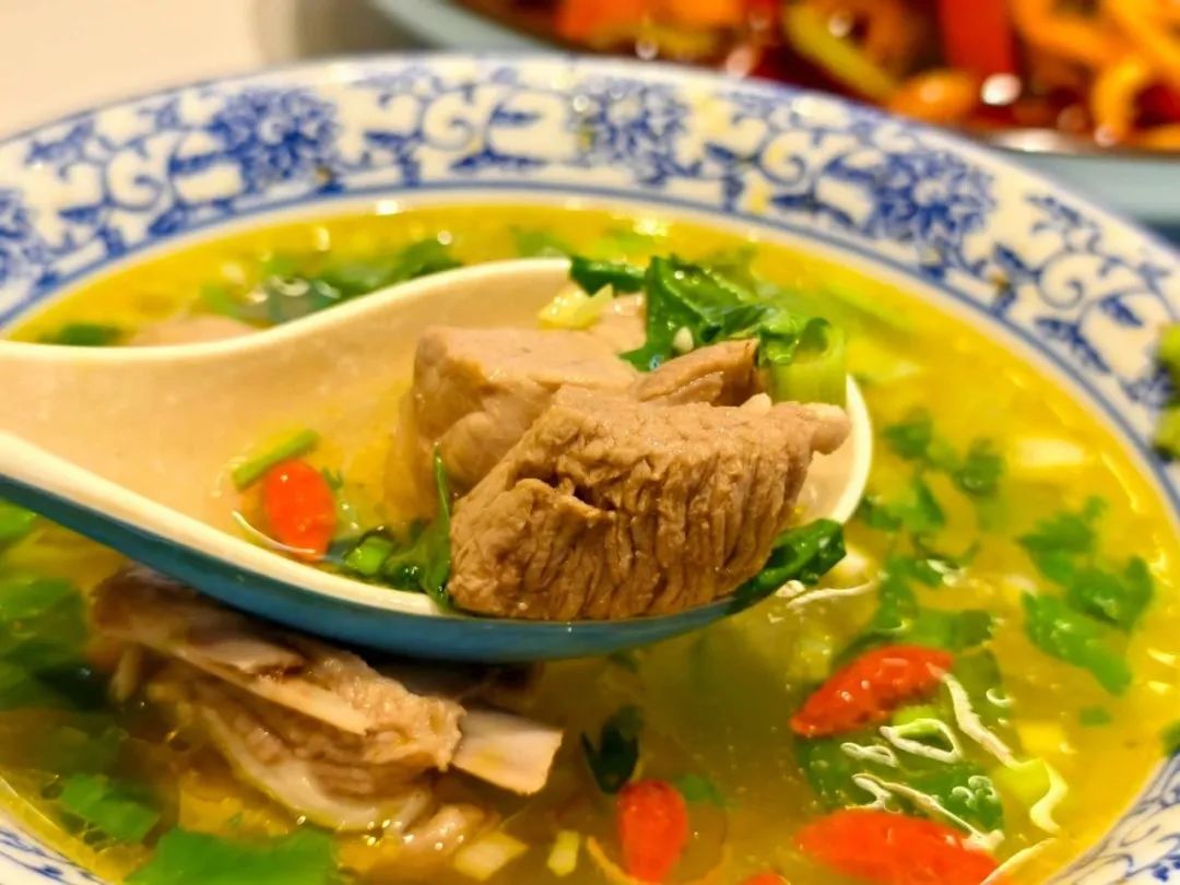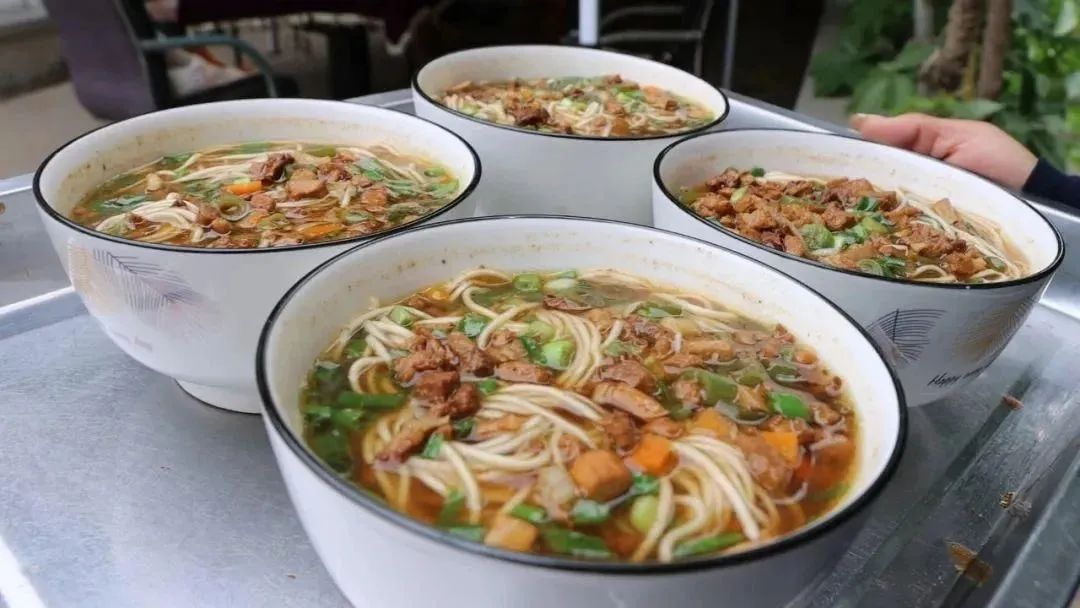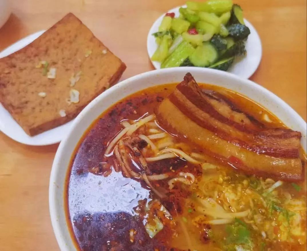 大肉面采用了牛肉拉面的方法制面,然后熬制鸡汤和猪骨,再用猪肉丁炒制香喷喷的猪肉臊子,最后配上葱花和香菜等辅料,再加上鲜亮的红油辣子,一碗香扑扑,热腾腾的大肉面就这样出锅了。韧性十足的细面,挂着浓郁的汤汁,吸溜一口,面条的筋道与汤汁的醇厚在口中交融,每一口都尽显大肉面的独特魅力,让人回味无穷。