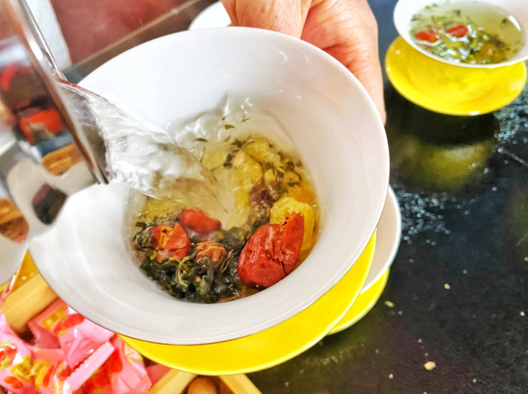 差不多功效的,还有甘肃花样百出的调饮甜茶。在苦涩的边销茶中加入本地特产的红枣、枸杞干,再放上足量的冰糖调味,干果香气和冰糖甜味使得茶水变得清香可口,如此制成的三泡台茶,解腻又好喝。
