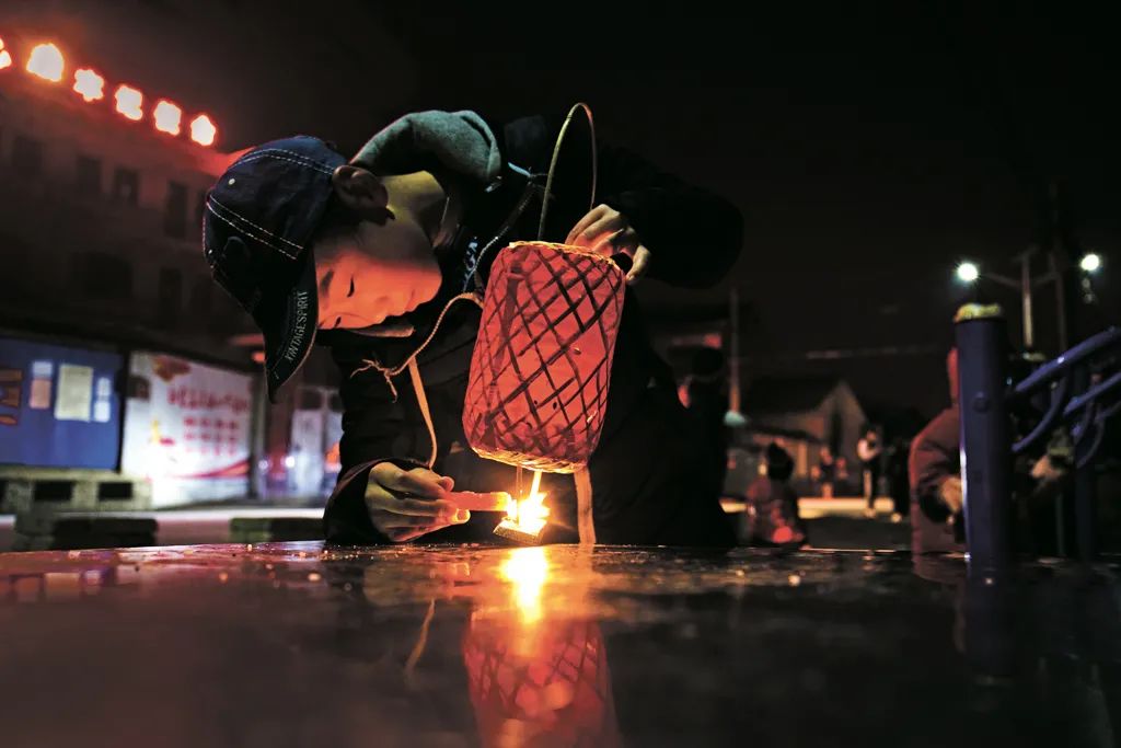 陇县张家庄村正在点火罐灯的娃娃。2019 年2 月11 日,张冬萍摄影