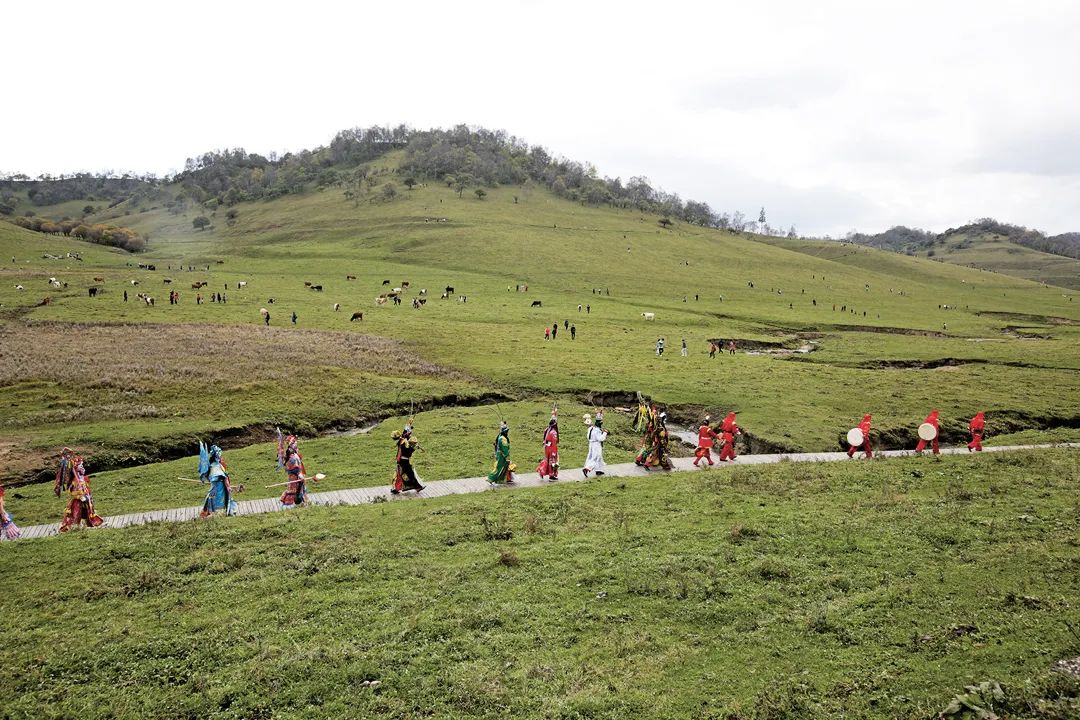 熙地社火演艺公司演员在关山草原表演步社火。2018 年10 月3 日,薛海亮摄影