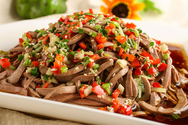温拌腰丝是由唐代羊皮花丝演变而来,因用猪腰子和其他辅料、调料、以及温拌的方法制成而得名,是陕西西安著名的传统特色菜。由于刀工细致,烹调方法考究,制作出的菜肴腰丝脆嫩,姜香、蒜香以及花椒的香味相得益彰,味道浓醇,清爽利口。温拌腰丝取材寻常之物——猪腰子,经过厨师妙手精心烹饪,再辅以特色的“温拌”,色香形美,味道浓醇。温拌腰丝被中国烹饪协会、陕西省商务厅评选为“陕西十大名菜”,还被中国烹饪协会评选为“中国菜”陕西十大经典名菜。 【 详细>>】